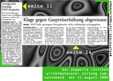 Am Sonnabend, den 12. August 2006 schreibt die Wilhelmshavener Zeitung auf der Seite 11 über ein Gerichtsurteil, dass die EWE-TEL im Zusammenhang mit der Gaspreiserhöhung, in Bezug auf deren Preis- politik, gewonnen hat. Auf Seite 24 dann schon wieder, mit fast identischem Inhalt.